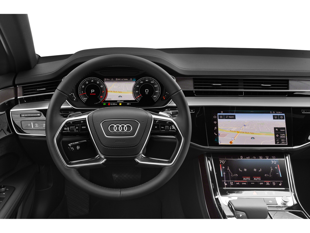 - Radio: Audi MMI Navigation Plus -inc: natural voice control system, MMI touch response w/dual-center displays (10.3-inch upper and 8.6-inch lower) and haptic feedback, limited-time subscription to Audi connect CARE assistance and security services, 6-month trial subscription to Audi connect PRIME and Audi connect PLUS online services, Audi smartphone interface including Apple CarPlay and Google Android Auto for compatible devices, HD radio technology, SiriusXM satellite radio w/90-Day Trial, Audi music interface w/front USB ports for data/charting and two USB ports for charging, Bluetooth® streaming audio for compatible devices, Bluetooth® wireless technology preparation for compatible devices
